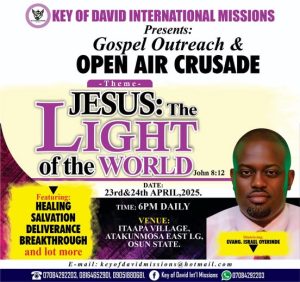 Programs Jesus the light of the world Crusade Total Freedom through Christ Jesus Gospel Crusade Three days Easter Medical Outreach at our Mission Camp in Araromi Olowu village. Two day Powerful crusade on Thur 12th – Friday 13th March, 2026 at Aratu village.